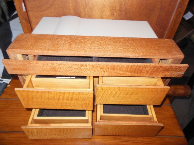 ''Golden Voice'' 1930's Motorola Radio/Jewelry Box is 14'' wide, 7 1/2'' deep, 7 1/2'' tall and has five drawers. The four larger drawers have an additional sliding shelf. This unit is made of Curly mango. Defiantly a ONE OF A KIND gift.
