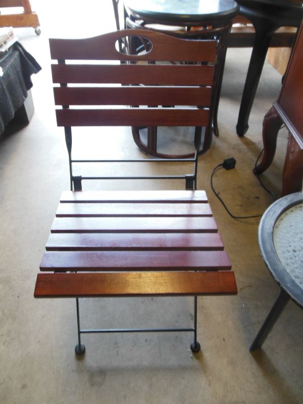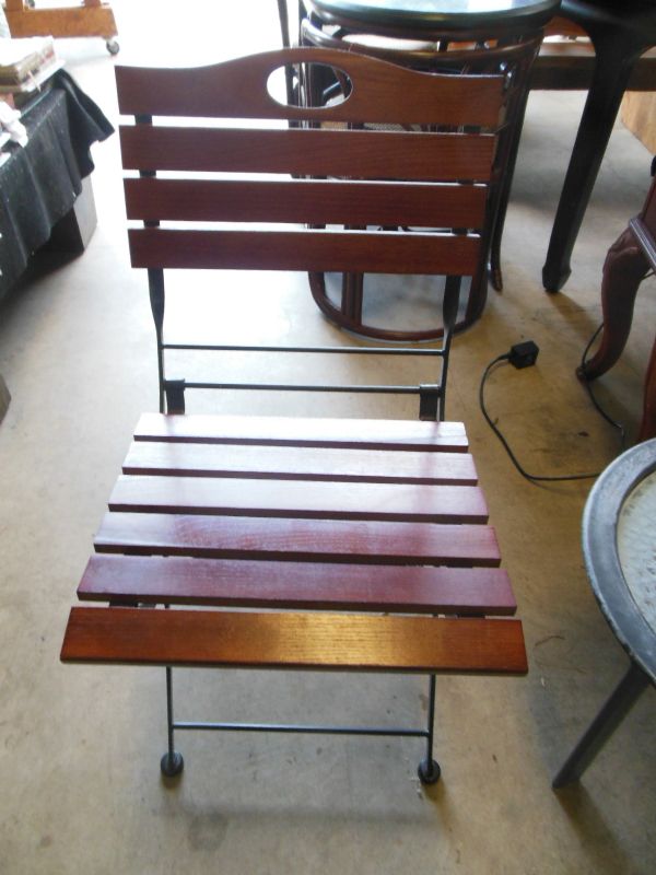 Folding chair with slatted wood seat and back. Metal frame.