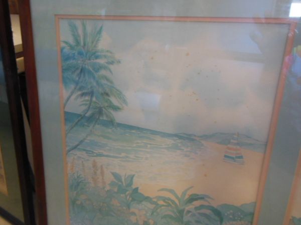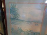 Koa frame picture palm trees and ocean.