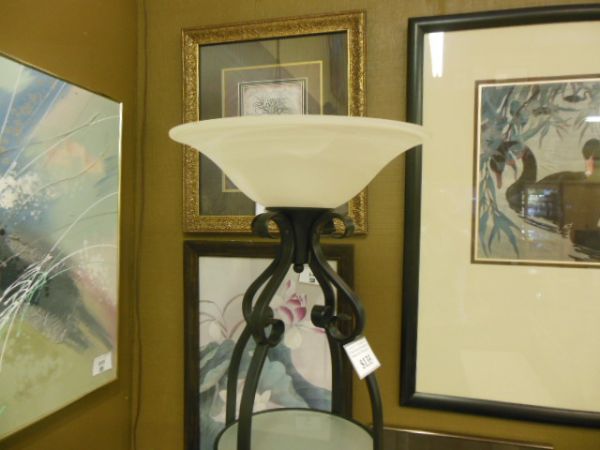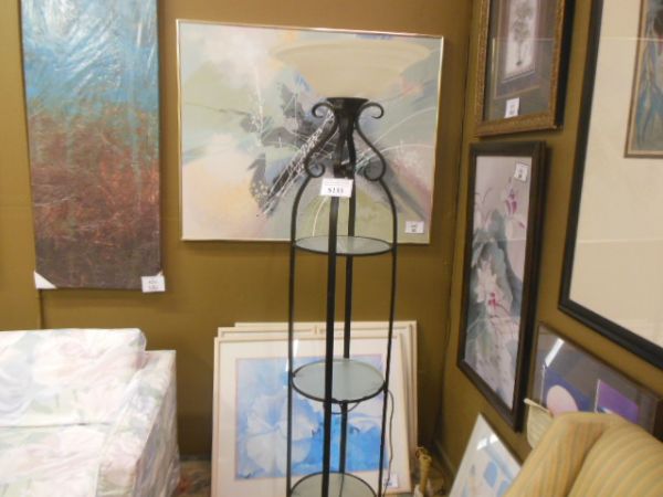 Torchere above three round frosted glass shelves.