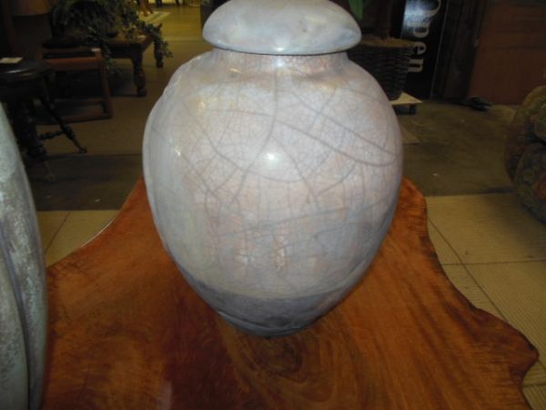 Large Evans Pottery Raku Ginger Jar with Crane Pattern and Lid.