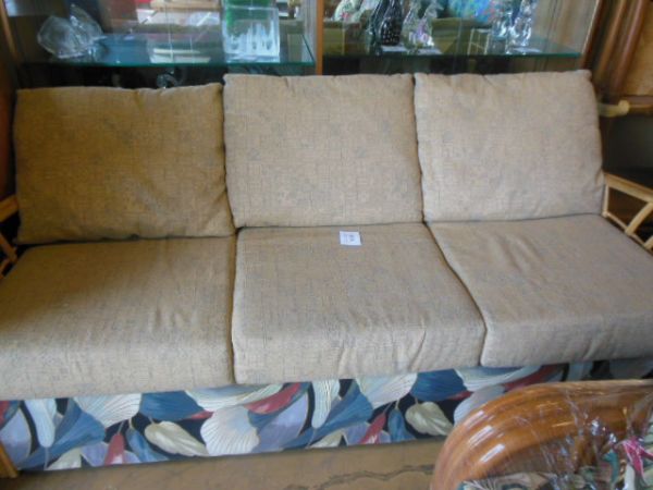 Mattress = 60'' x 72''. Overall = 75'' Long. Open rattan arms with upholstered back and base.