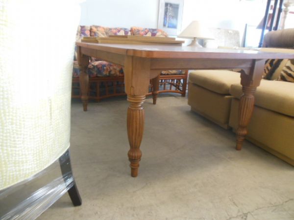 Solid wood dining table with a British West Indies flair. Two 18'' leaves allow this table to extend to a generous 9' long. Custom pads to protect the table both with and without leaves.