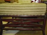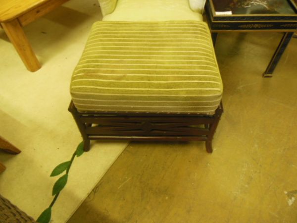 Avocado green stripe upholstered tops on these beautiful dark (think cherry) rattan bottoms.