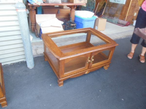 Solid Oak Curio Cocktail/Map Table w/Glass Top and Sides - 26'' x 38'' x 19.5''H.