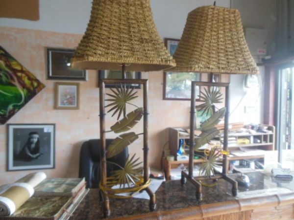SET OF TWO - Metal Tropical Leaves Base w/Woven Shade - 33''H.