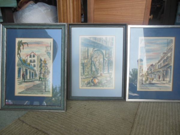 SET OF THREE - New Orleans Street Scenes Colorized Pen and Ink.