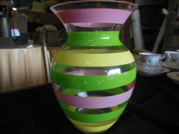 Vintage Striped Vase - 4.5''dia x 7''H - Pink, Green, Yellow Stripe.