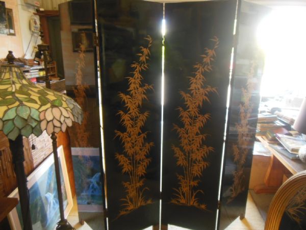 72''H x 4 @ 18''W Asian Four Panel Screen w/Painted Scene on One Side, Gold Bamboo on Black Lacquer on One Side.