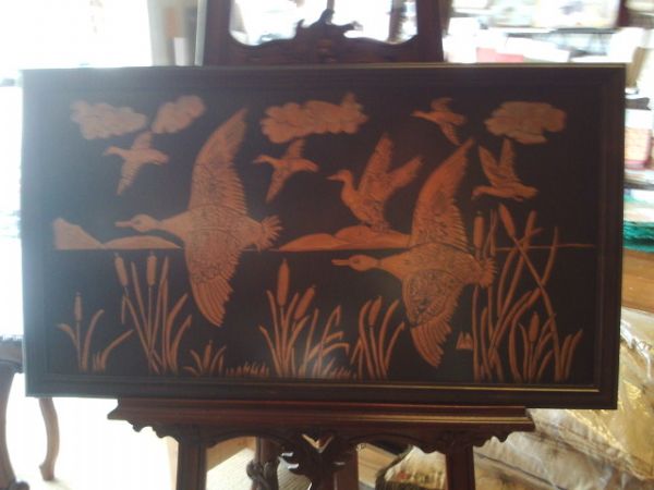 Asian Style Inlaid Copper Ducks and Cattails - 32'' x 18''H.