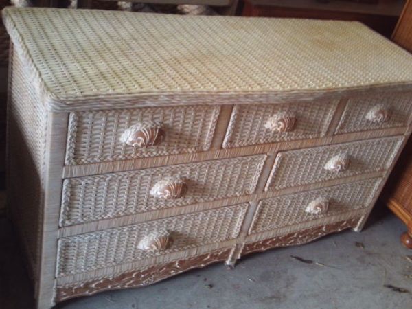 55'' x 21'' x 30''H 7 Drawer Dresser White Rattan w/Wood Carving.