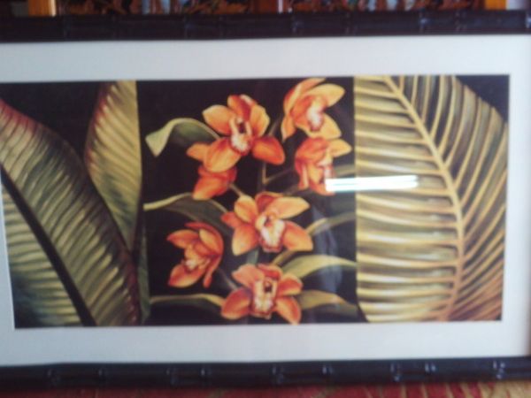 30'' x 48''W Tryptic Banana/Orchid w/Dark Faux Bamboo Frame.