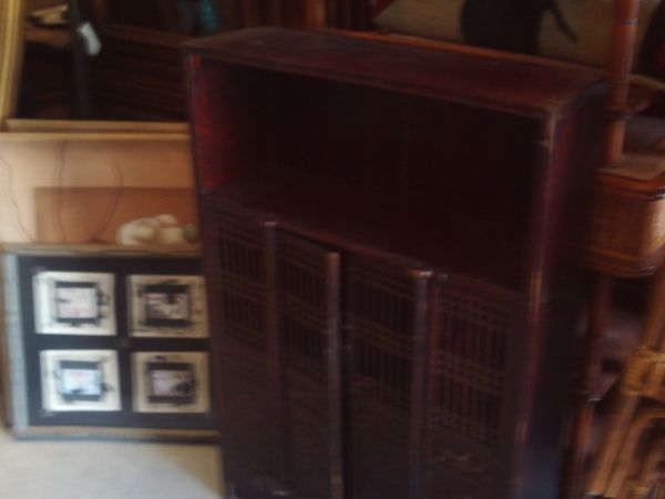 Asian Wood Shelf w/Carved Doors - 25''W x 8''D x 37.5''H.