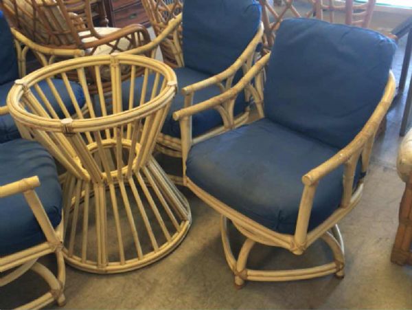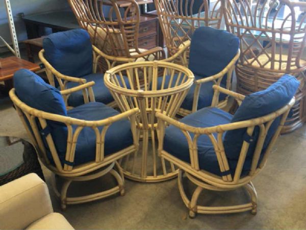 SET OF 5 pcs -- FICKS REED brand. Rattan dining room set with swivel rocking chairs. Sunbrella fabric. Very comfy. Base can take 48'' glass..