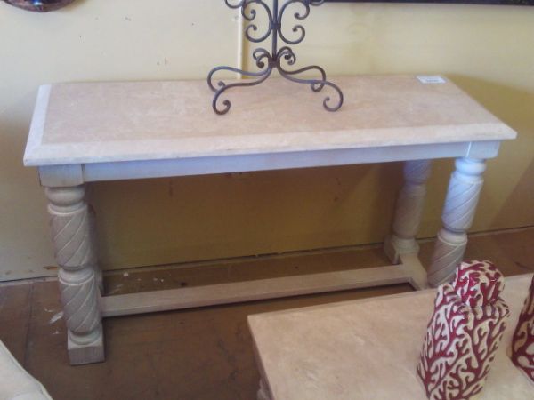 DREXEL Stone Top Hard Wood Base Console Table w/ carved legs Antique White - 54x19x30.5 .