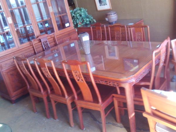 Rosewood Dining Room Set Table w/2 leafs, glass, 8 chairs with carved wood backs 44x80(to 44).