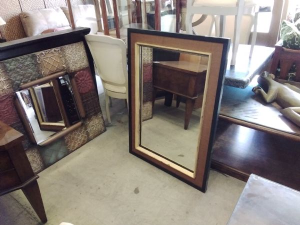 Mirror wood and canvas frame black, brown, gold.