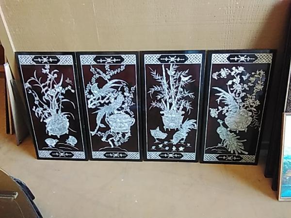 SET OF 4 -- Black panels with inlaid shell art from Korea. .