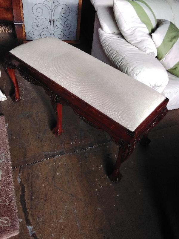Bench. Carved wood, upholstered seat.