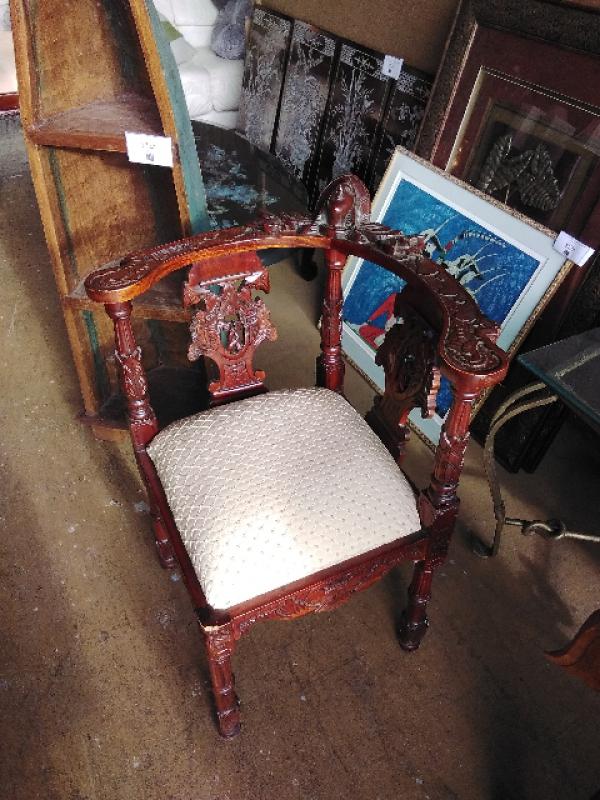 Corner Indian Chair, Carved Wood. Face carving on the top.