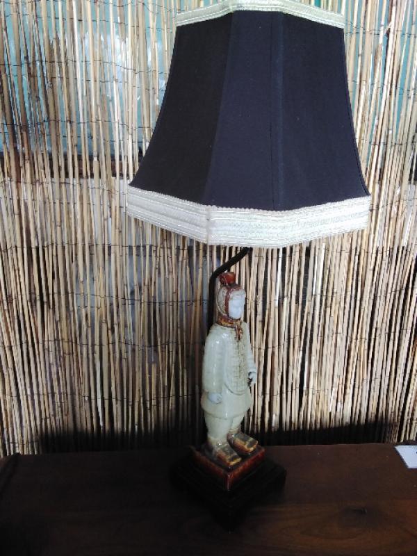 Table Lamp. Terracotta Warrior. Black lamp shade with cream trim .