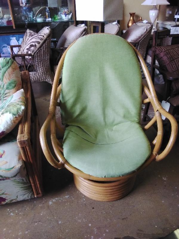 Rattan swivel rocker with cushion.