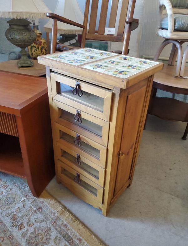 Small Tile top 5 - drawer cabinet w/glass doors - Mexican pine.