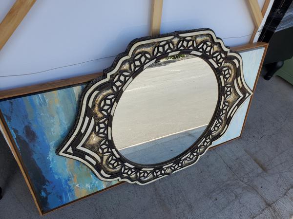 Round Mirror Inlaid Ivory and Wood, brass hammering details.