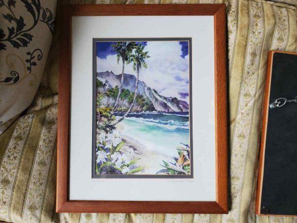 Small Painting reproduction - Eve's Dream - Palm tree and ocean by P. Pendarvis - Hardwood frame.