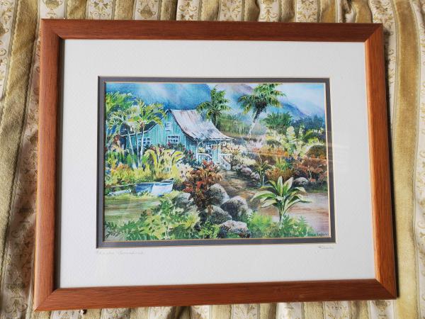 Small Painting reproduction - Kanaka Homestead - House inn tropics by P. Pendarvis - Hardwood frame .