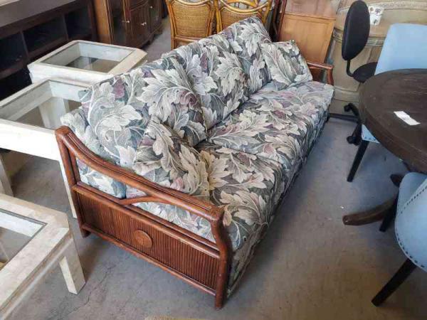 Sleeper Sofa -- Rattan Arms Leaf design fabric.