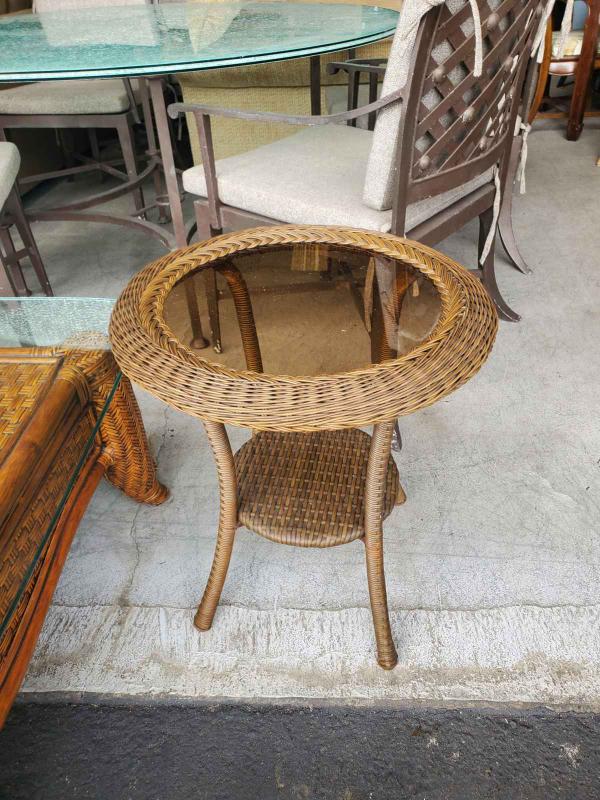 Outdoor round side table with glass.