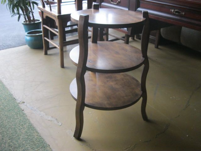 Three tiered round side table solid wood. The height is 28'' tall and the graduating tiers measure 18'' diameter on the bottom shelf, 17'' diameter on the center shelf, and 15'' diameter on the top shelf.