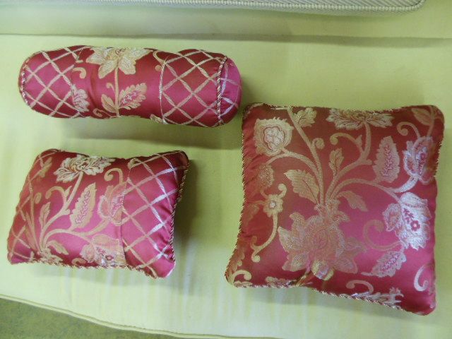 Nice group of three throw pillows the largest measuring 16'' square, the medium one is 16'' wide, and 12'' long while the small one is 18'' long and 6'' in diameter.