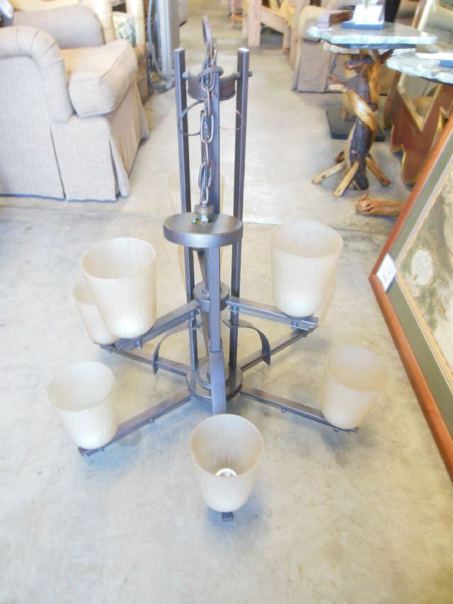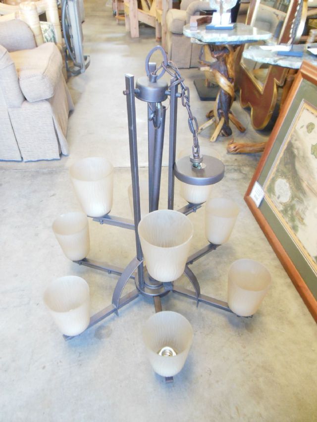 The chandelier is 27'' across with a 31'' drop. Home Depot 219.00 Riverside Collection