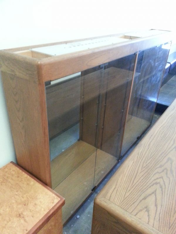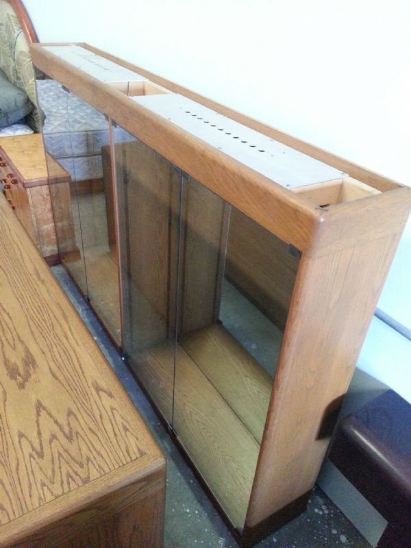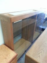 Large wood shelving unit with thick glass shelfs, mirror, glass doors and light