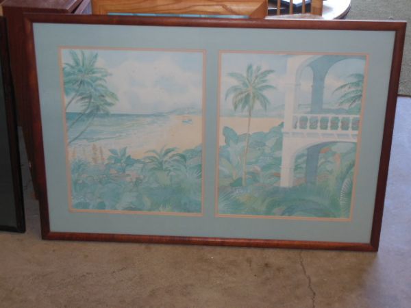 Koa frame picture palm trees and ocean.