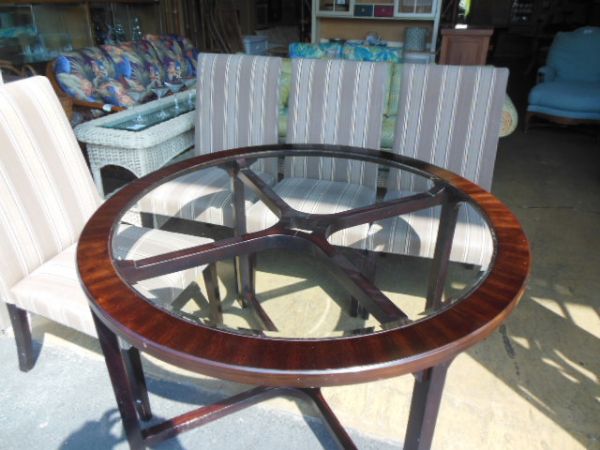 Dining Room Table with Round Glass top & 4 Chairs dark wood.