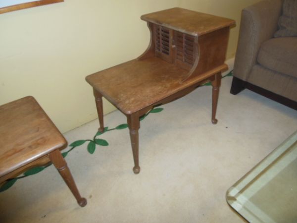 SOLID maple early American end tables with louvered doors. Need some TLC, but SOLID!