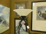 Torchere above three round frosted glass shelves.