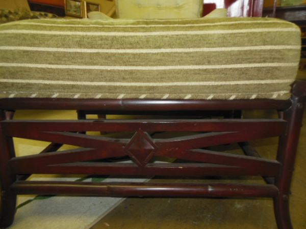 Avocado green stripe upholstered tops on these beautiful dark (think cherry) rattan bottoms.