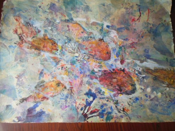 29'' x 41'' Paper Mache Collage w/Fish and Chop - UNIQUE!.
