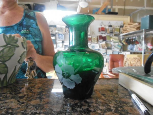 8''H Emerald Green Blown Vase w/Hibiscus Cut/Sandblast Decoration.
