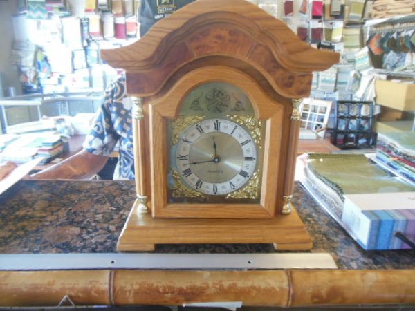 Solid Oak Mantel Clock w/Burl Trim - 13''H.