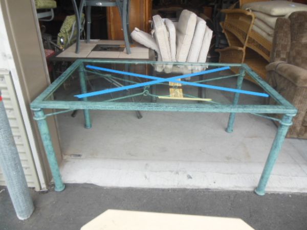 Green Patina Metal Frame, Glass Top Dining Table - 36'' x 60'' x 28''H.