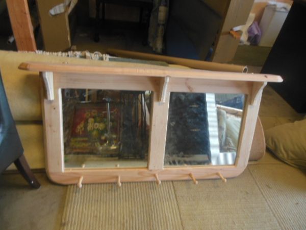 44''W x 23''H Double Mirror with Top Shelf and Hanging Pegs - Rustic and Handmade.