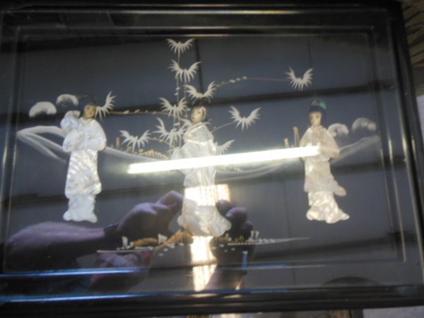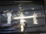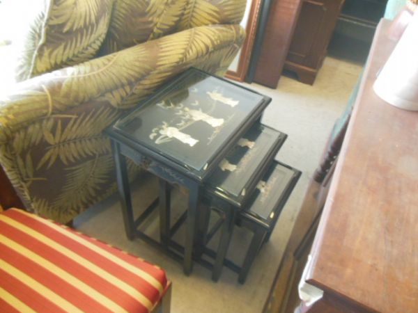 SET OF THREE - Nesting Tables w/Asian Raised Figures, Glass Tops.