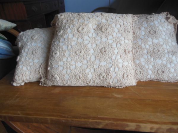 SET OF THREE - Ecru Crocheted Pillows - 15'' x 15''.