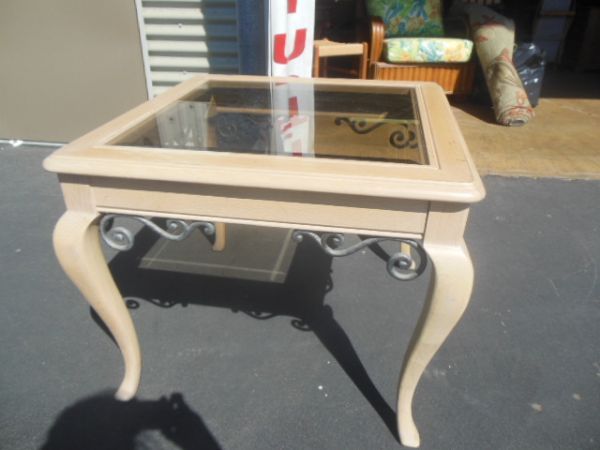 Blond Wood & Wrought Iron Glass Top Table 27.25'' x 27.25'' x 22.5''H.