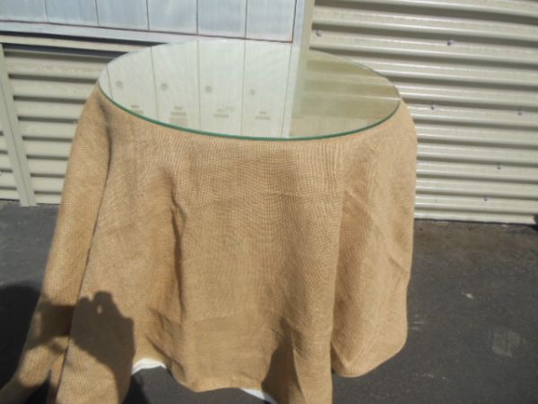 Round Decorator's Table w/Glass Top and Burlap Cloth 25''dia x 24''H.